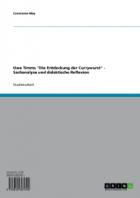 Uwe Timms „Die Entdeckung der Currywurst“ In dieser Studienarbeit von Constanze Mey, die im Grin Verlag erhältlich ist, erschien bereits zum Wintersemester 2004/05 und entstand im Zuge des Hauptseminars „Analyse literarischer Texte in der Sekundarstufe II“. Auf zwanzig Seiten erläuter Mey die Novelle „Die Entdeckung der Currywurst“ von Uwe Timm näher und geht dabei besonders darauf ein, wie man sie im Unterricht erarbeiten kann. Neben einer Inhaltsangabe zeigt sie die formalen Aspekte auf und geht auf die motivischen, symbolischen und intertextuellen Aspekte ein. Auch wird der historische Hintergrund, in dem die Handlung spielt, näher erläutert. In einem dritten Kapitel, welches eigentlich das zweite ist, da die Einleitung schon als erstes Kapitel gezählt wird, geht es um die „Überlegungen zur Textauswahl und zu den Voraussetzungen der Schüler“, sowie die „methodischen Zugangsmöglichkeiten zu ausgewählten Aspekten“. Als letztes Kapitel wird der „Schluss“ genannt. Dieser befindet sich laut Inhaltsangabe auf Seite 19, ist jedoch erst auf Seite 20 zu finden. Eineinhalb Seiten Literaturverzeichnis runden die Arbeit ab. Im Inhaltsverzeichnis wird auch ein Anhang angekündigt, der jedoch nicht zu finden ist. Die Arbeit ist relativ oberflächlich gehalten, was sicher auch auf die Kürze zurückzuführen ist. Für eine Hausarbeit in einem Hauptseminar hätte ich um ehrlich zu sein mehr Tiefgang erwartet. Auch wäre ein einheitlicher Schreibstil ganz schön gewesen, damit der Text nicht sofort den Eindruck eines Zitatesammelsuriums erweckt, sondern einer eigenen Arbeit entspricht. Für einen ersten groben Überblick über die theoretischen Möglichkeiten und Aspekte dieses Romans ist es nicht schlecht, will man aber wirklich mit dem Buch arbeiten, ist diese Arbeit völlig ungenügend und man sieht sich besser nach anderen Quellen um.
